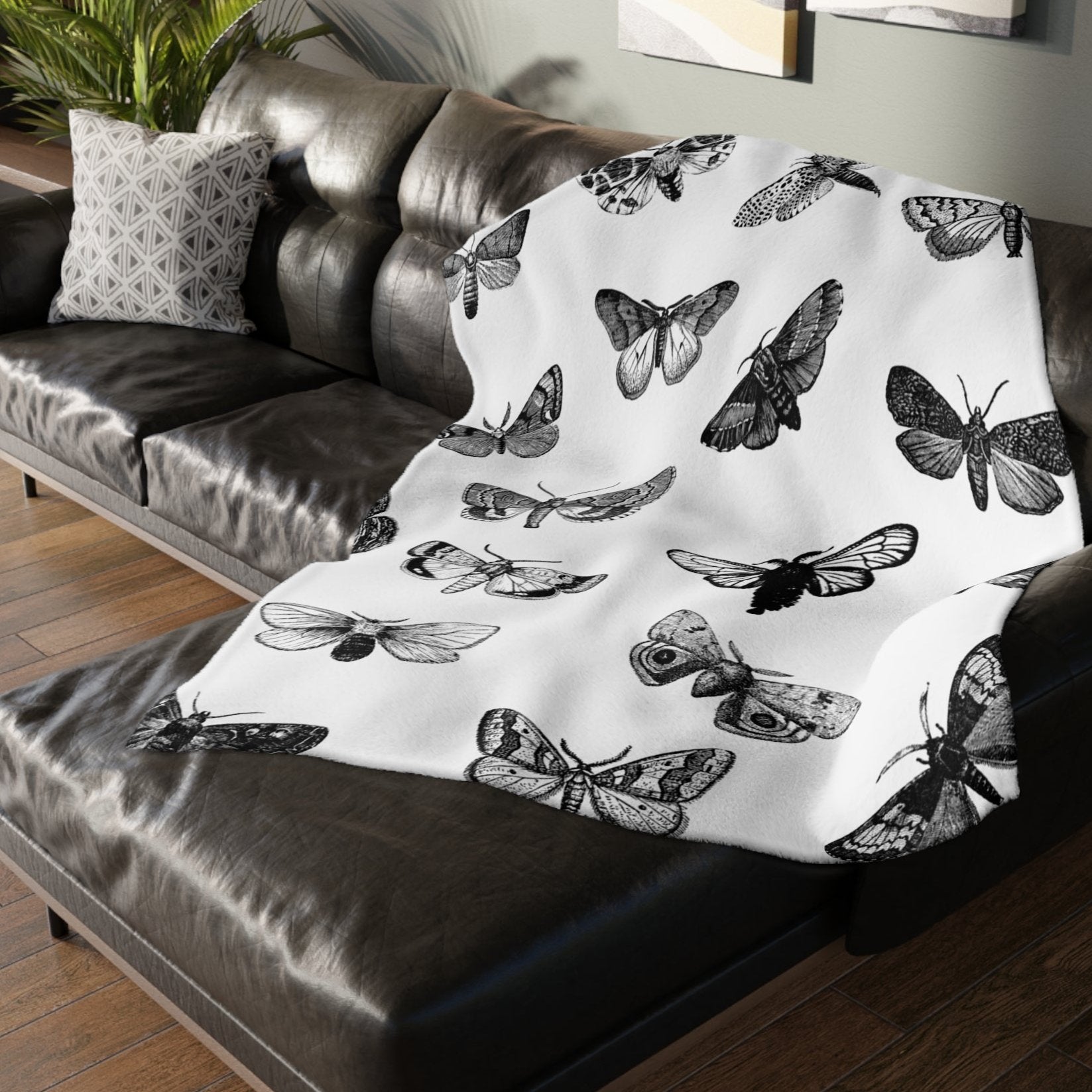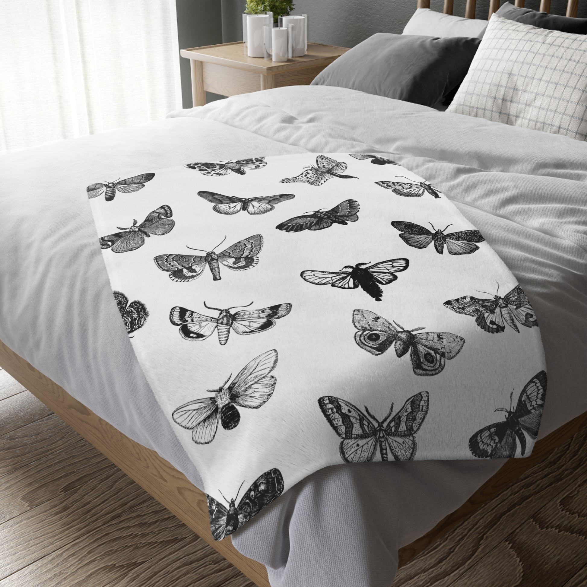 Elevate your cozy vibes with our Antique Print Black Moth on White Velveteen Blanket!