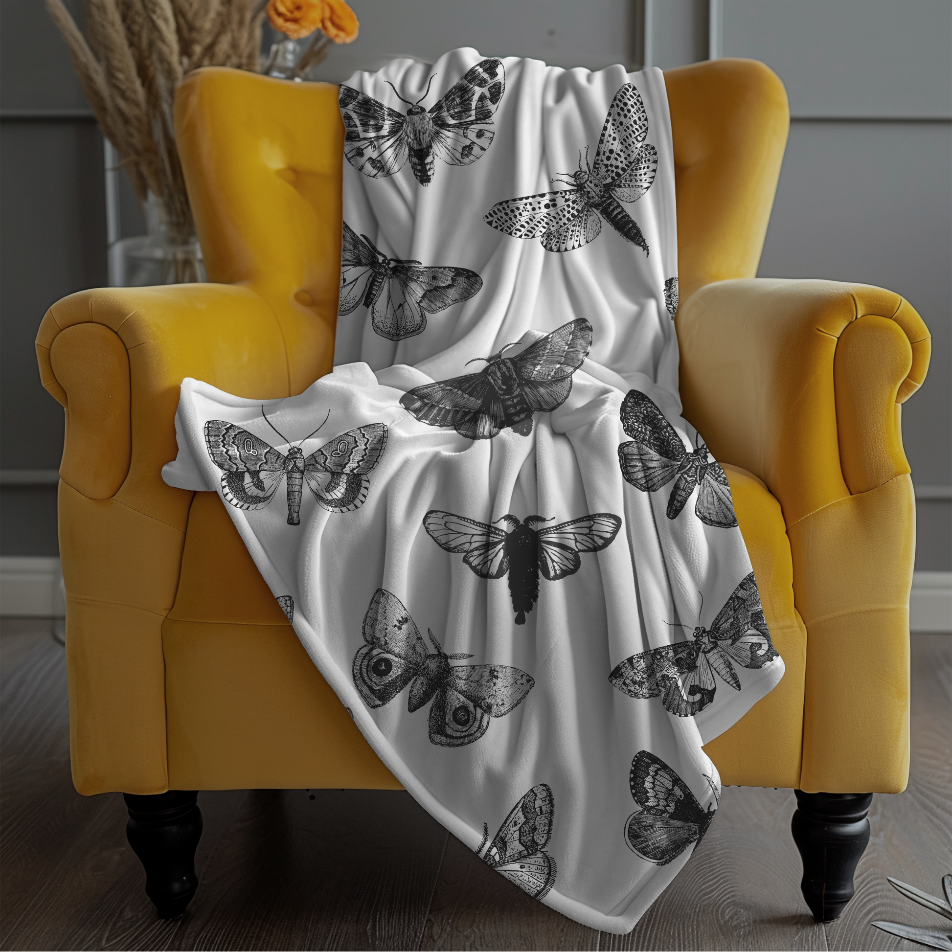 This stunning blanket showcases ethereal, black, vintage print moths fluttering across a soft white canvas, making it a chic addition to any decorating aesthetic.
