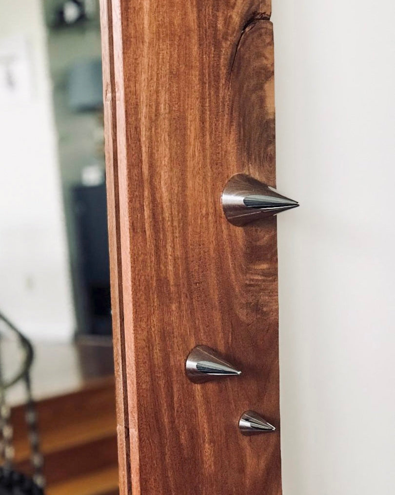 Crafted from solid mahogany wood and finished with hand-fabricated chrome spikes in three oversized dimensions, it leans with intention rather than hangs, allowing the presence of the piece to speak for itself.